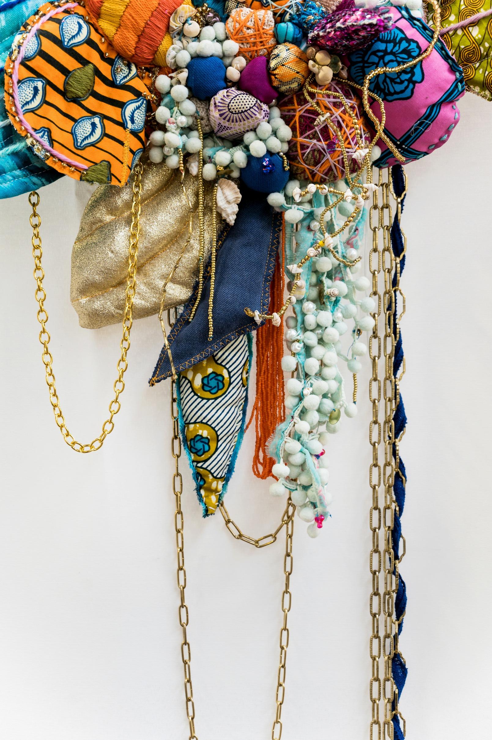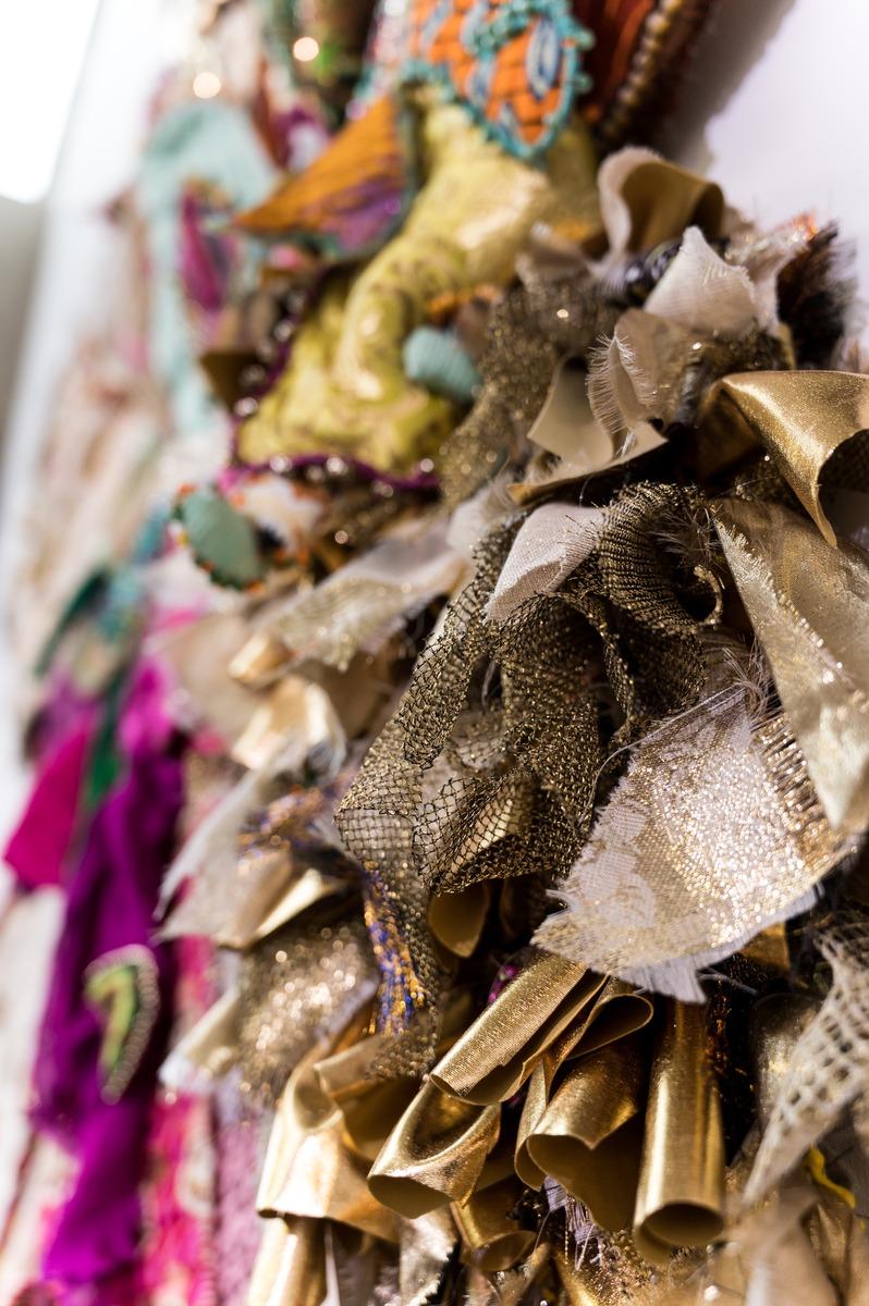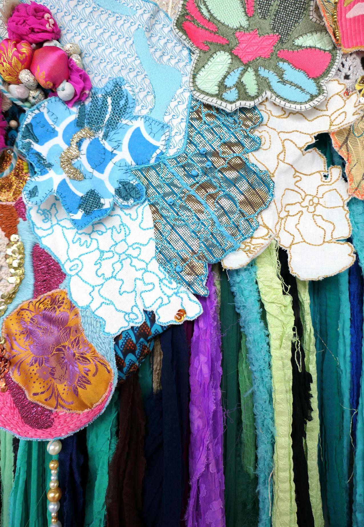 Motif en balade, 2020, tissus, broderies, sequins, paillettes, crochet, chaines métalliques, 170x80cm