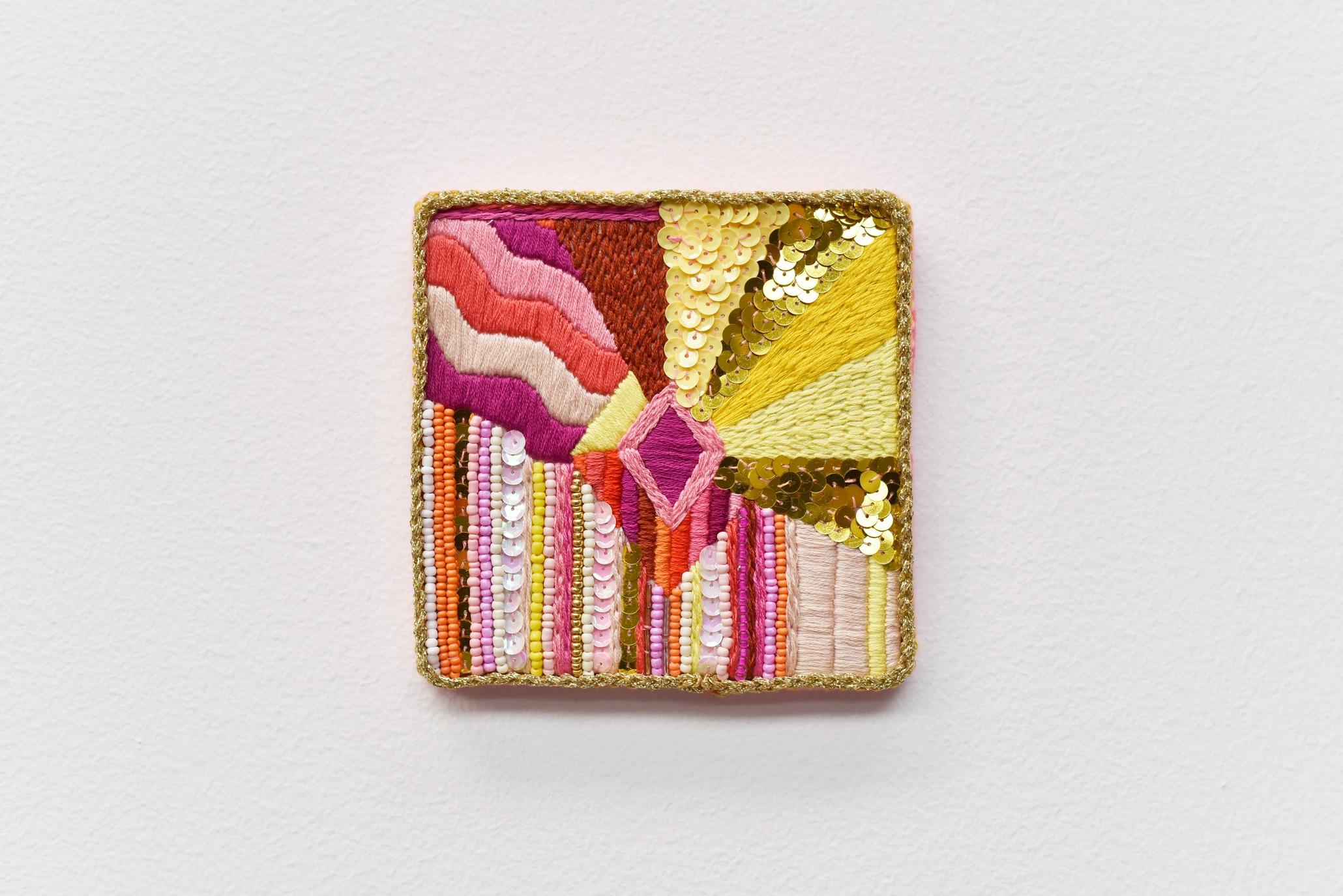 Puesta del sol, 2023, Broderie manuelle, sequins, perles, crochet, support peuplier, 13×13 cm