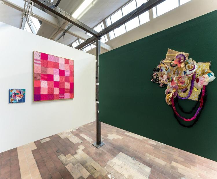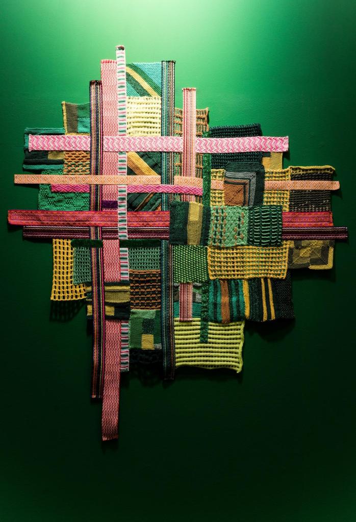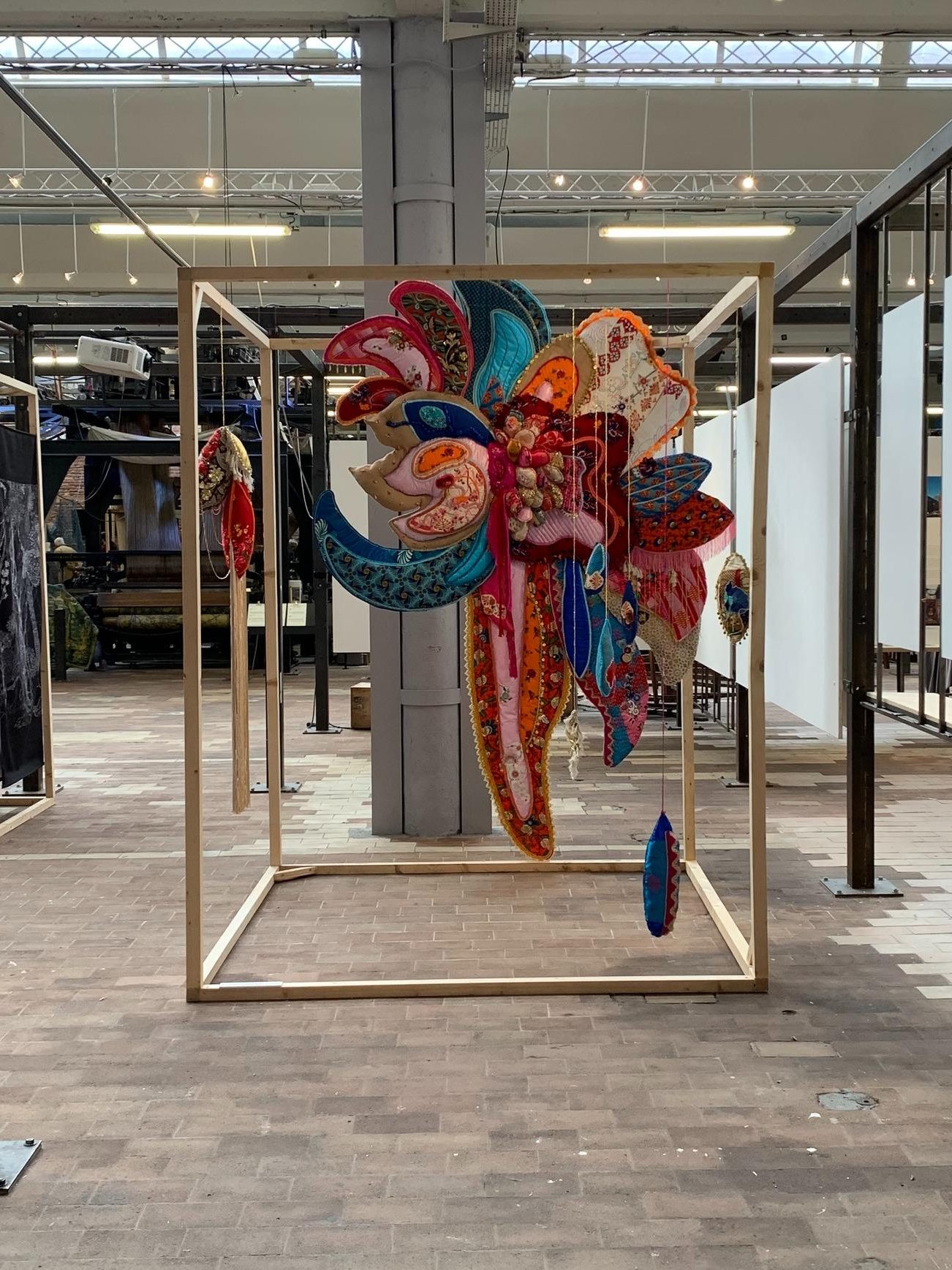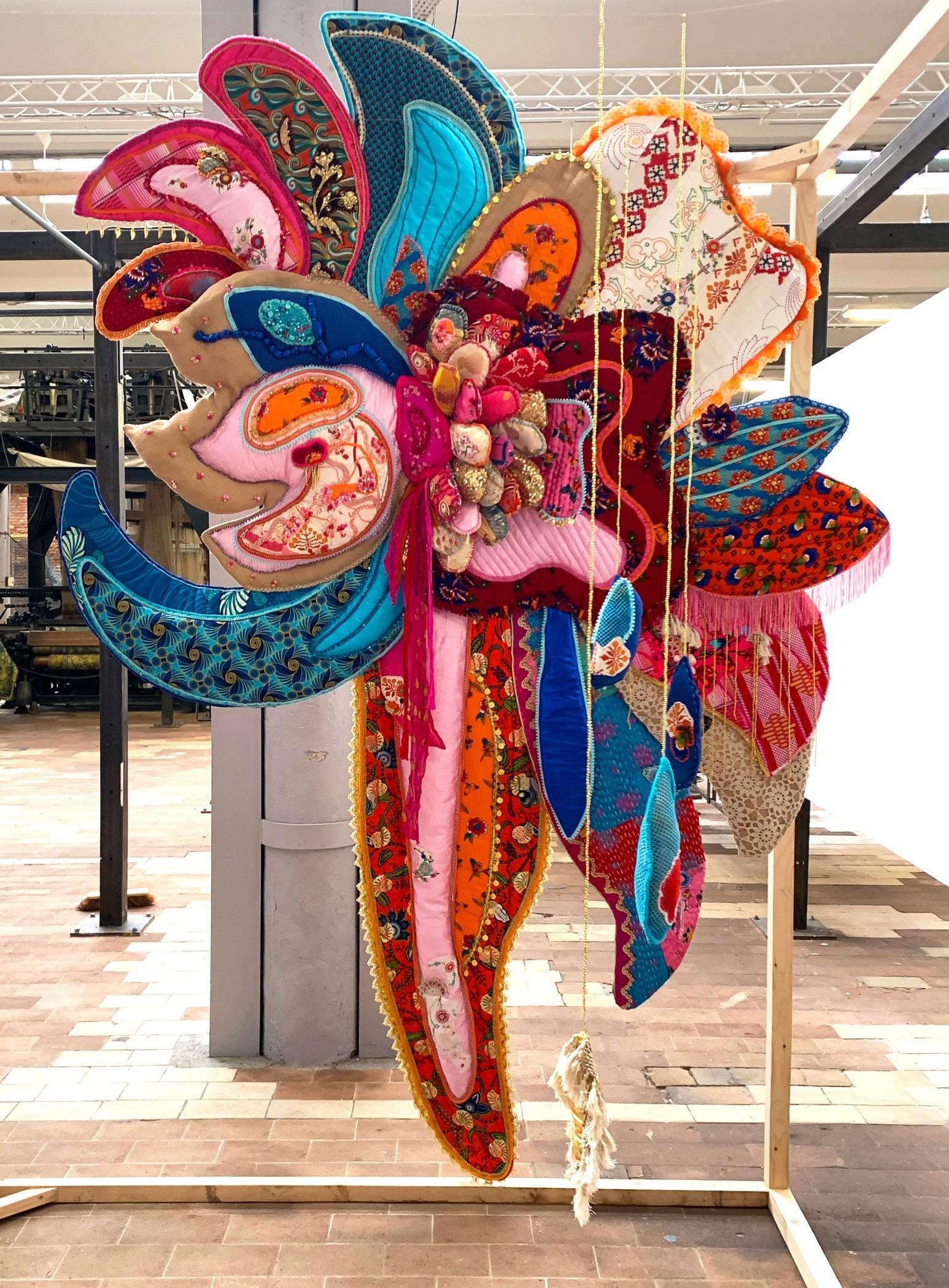 Oeuvre collaborative réalisée avec les couturières des structures d’insertion par l’emploi, Arpège, Arc-en-Ciel, le CCAS, le GIP réussir en Sambres Avesnois, projet coordonné par la Cité des géométries à Maubeuge avec le soutien de la DRAC Hdf, la DDTES, et l’Union Européenne
