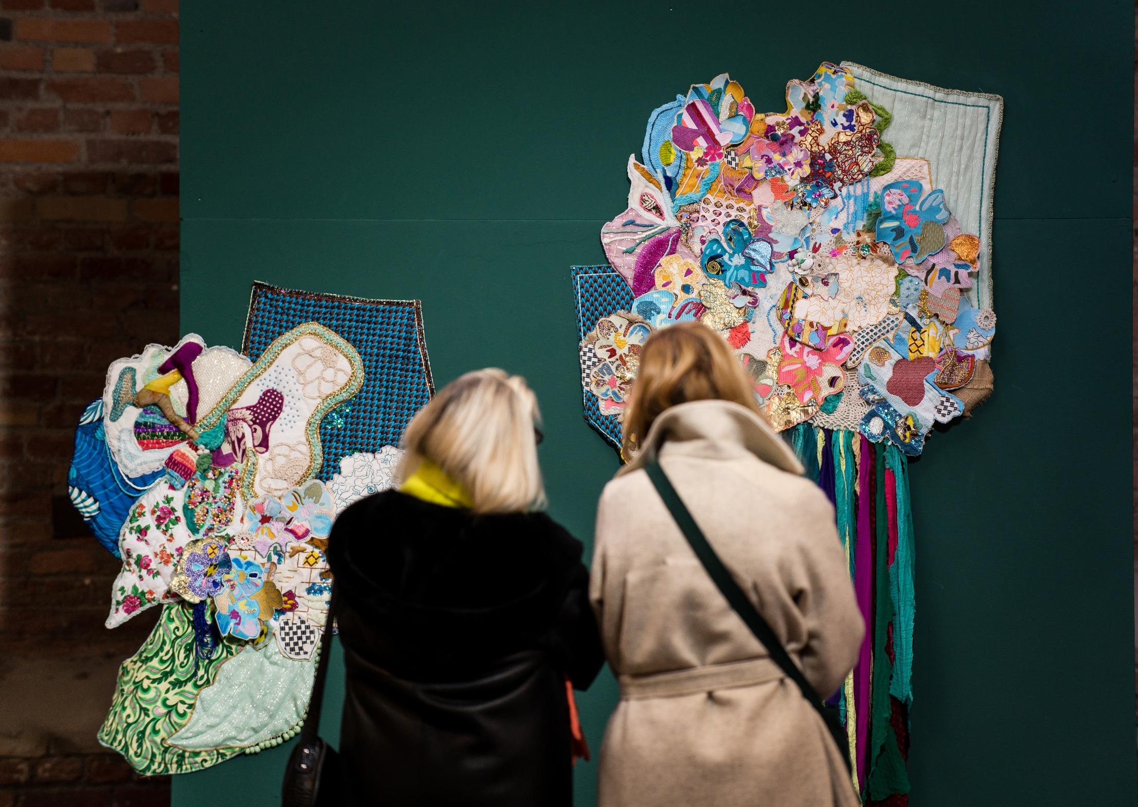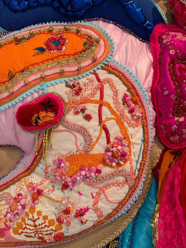 Enchanter l’ordinaire, 2022, tissus, broderies manuelle et machine, crochet, sequins, toile brute, perles, 110x80cm et 180×90 cm