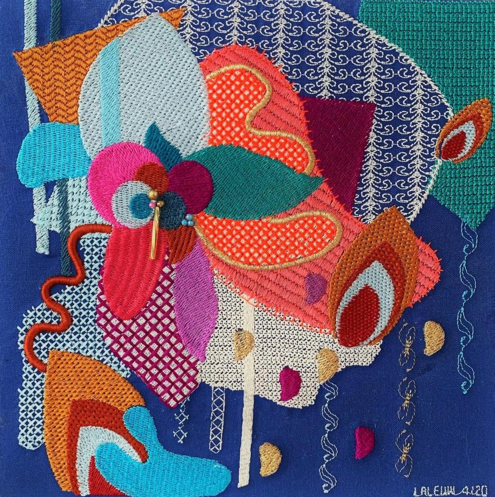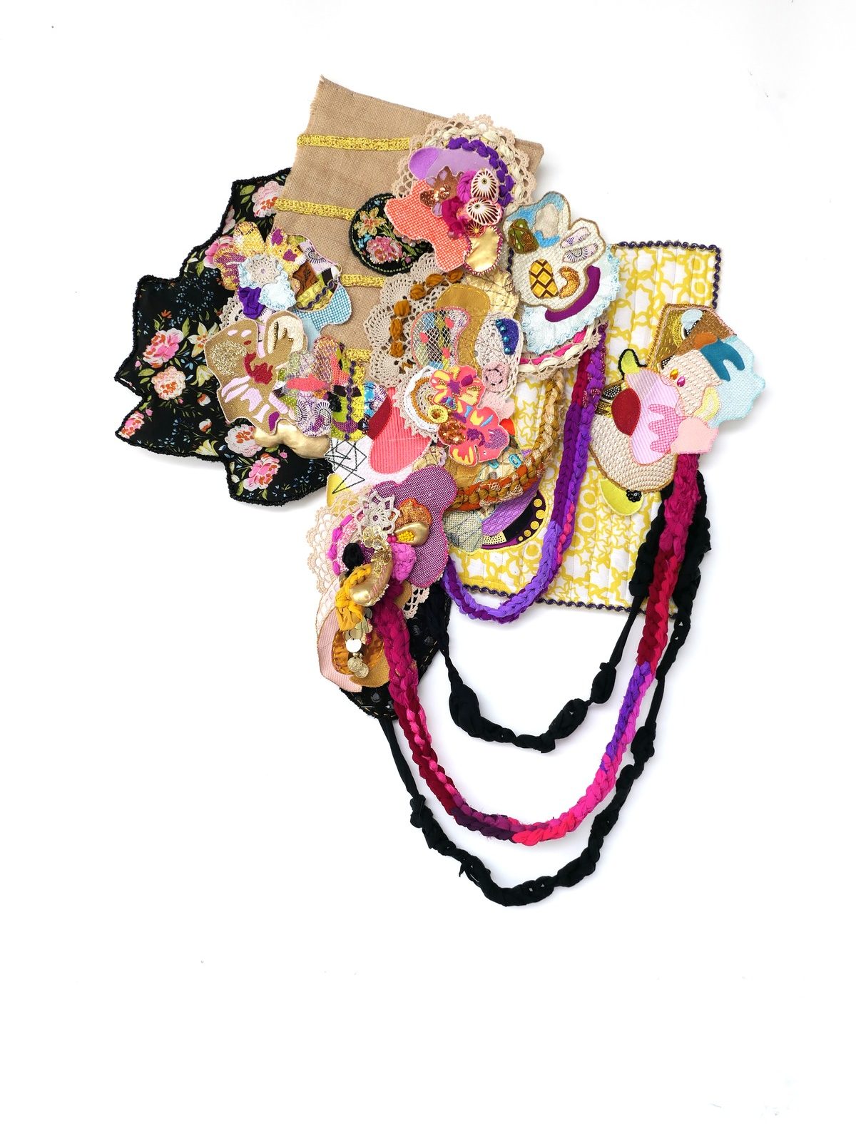 Joyeuse Tristesse, 2022, Tissus, broderies manuelles, broderies machine, crochet, sequins, toile brute, perles, 103 x 85cm