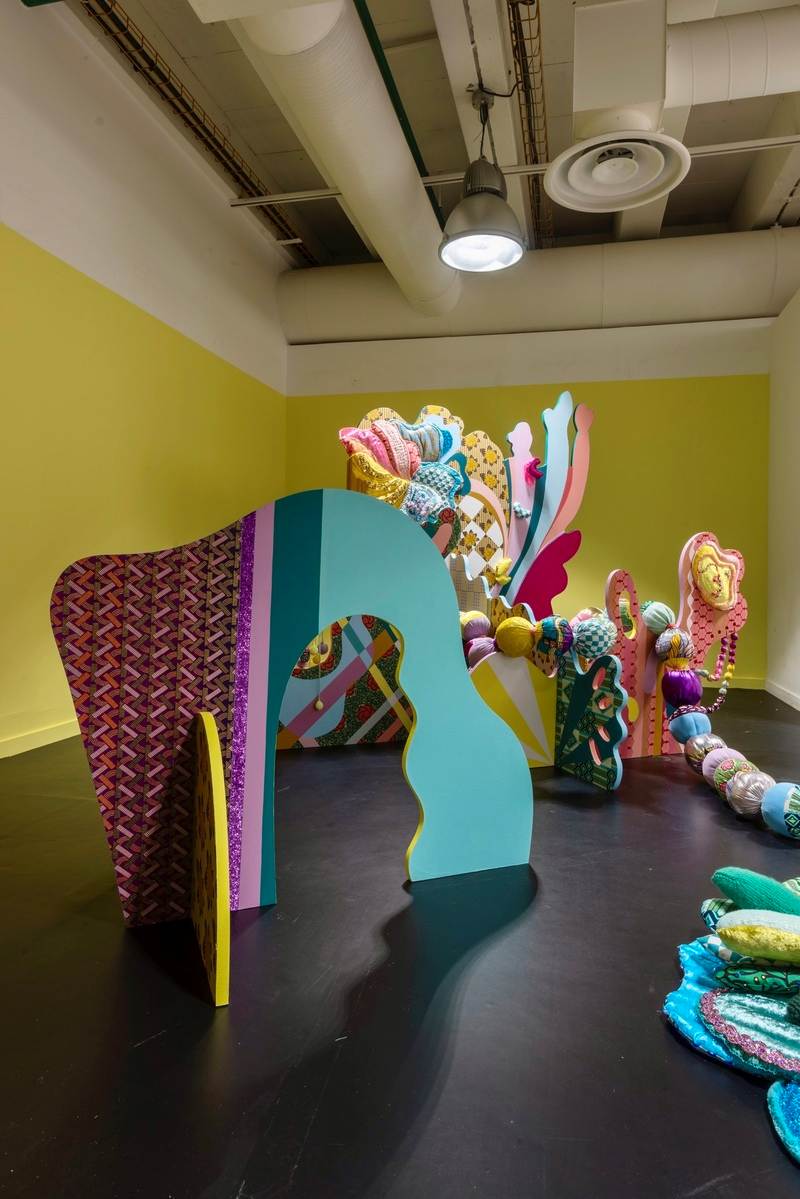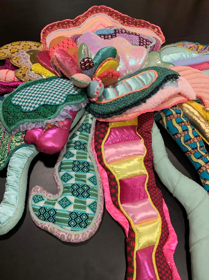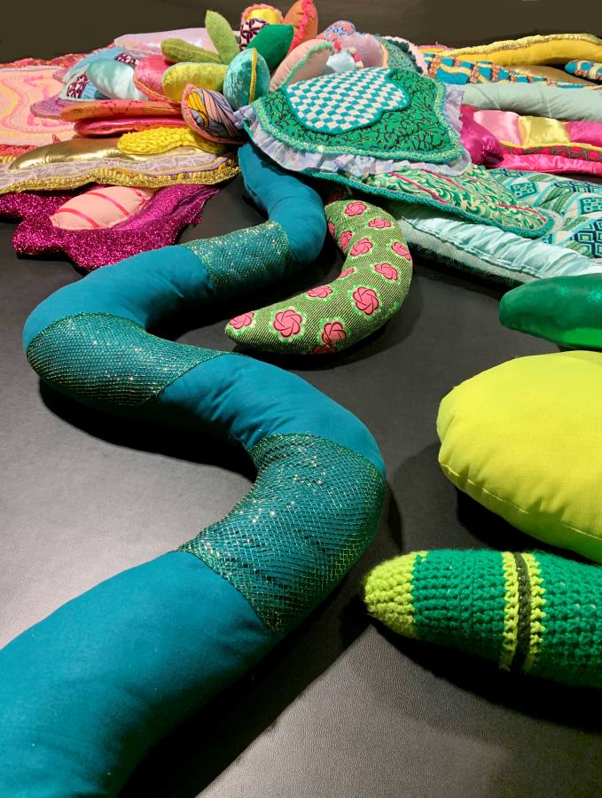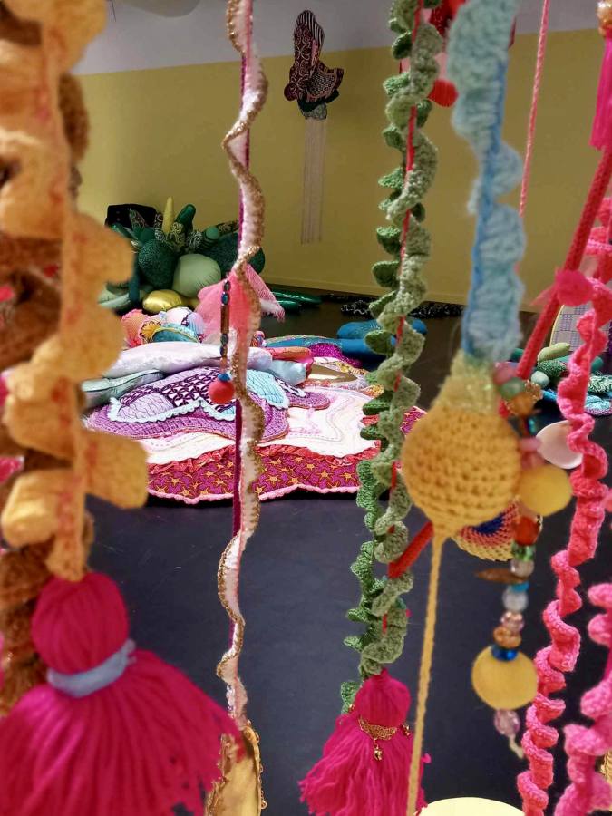 Cette installation à la fois douce, duveteuse, bruyante, silencieuse et peuplée d’étonnants éléments végétaux, vous invite à traverser une forêt de lianes, rouler sur une immense pieuvre florale, jouer à disparaître derrière d’étranges plantes… Cette jungle de tissus, haute en couleurs, cache de nombreuses surprises visuelles et sonores pour les tout-petits et leurs parents…
