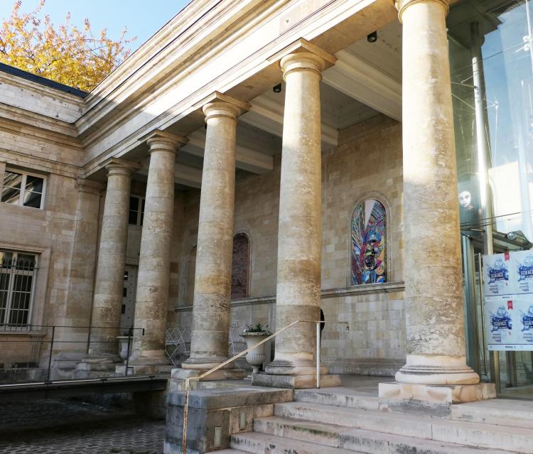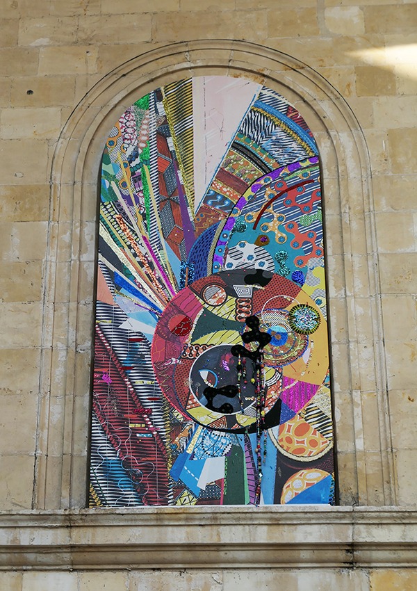 Installation sur la façade de la bibliothèque Louis Aragon à Amiens, Parcours d’art Contemporain d’Amiens Métropole, 2018, impression sur bâche, tissus, broderies, sequins, perles, 205×95 cm