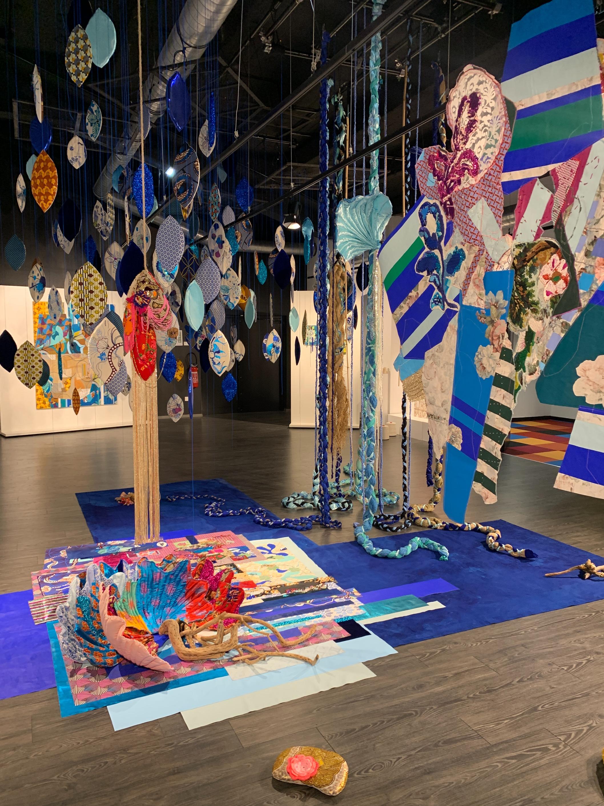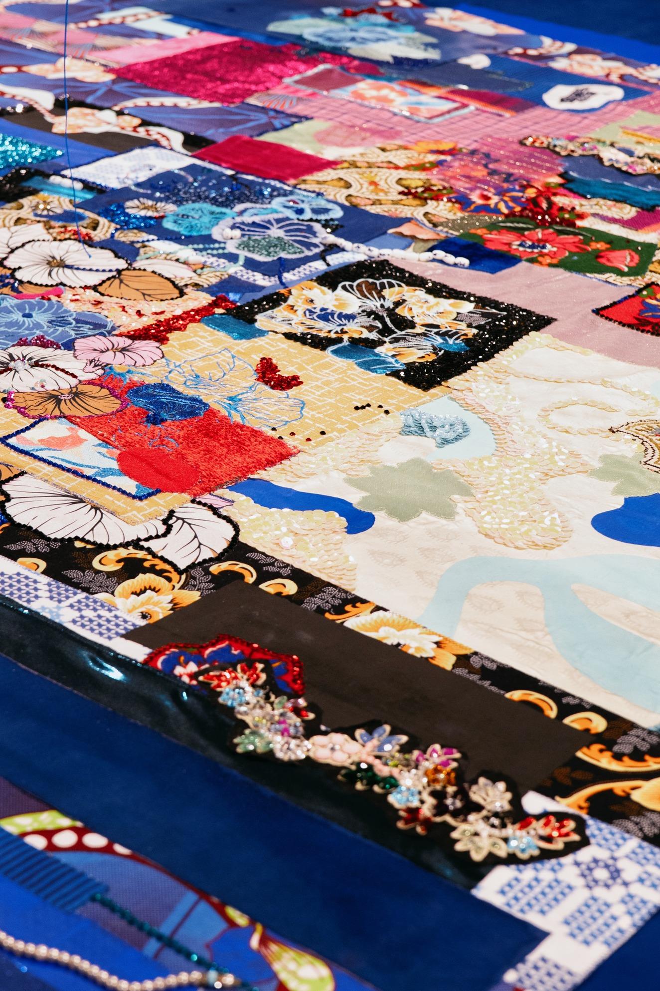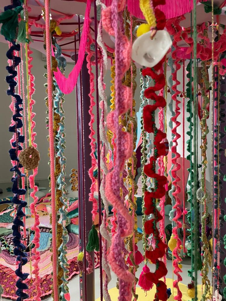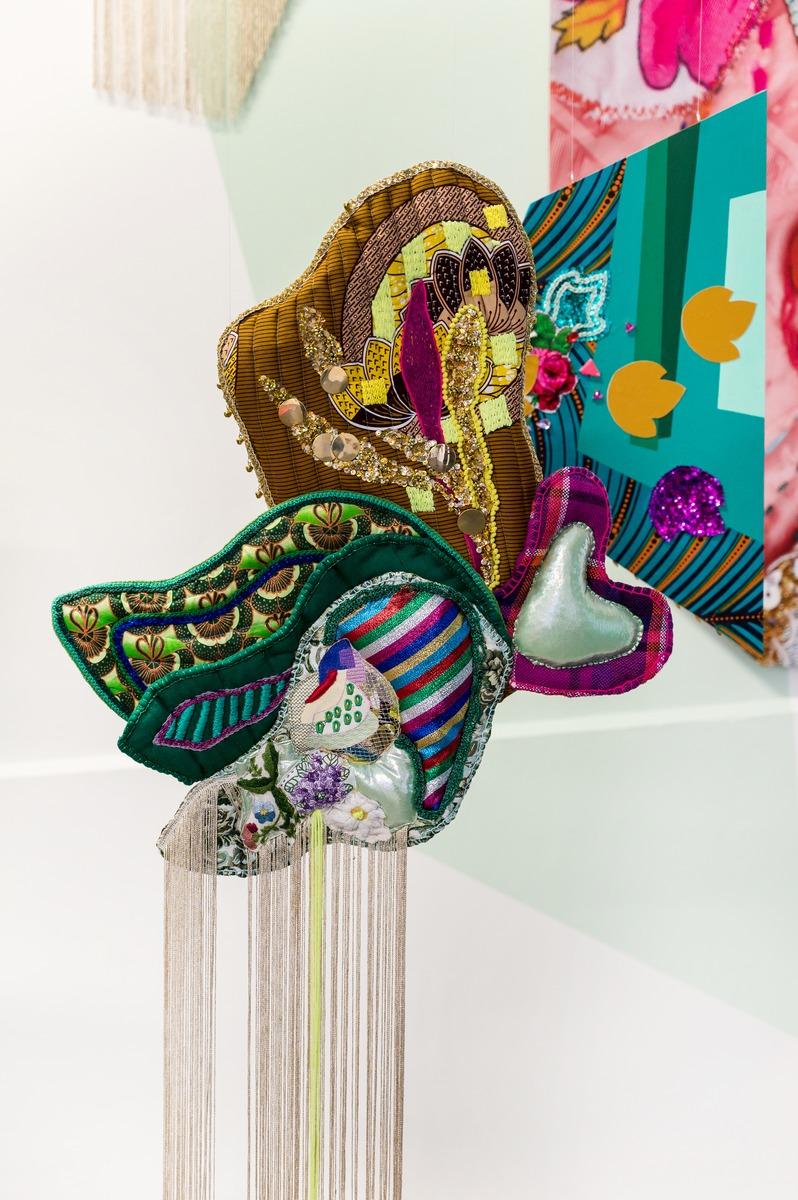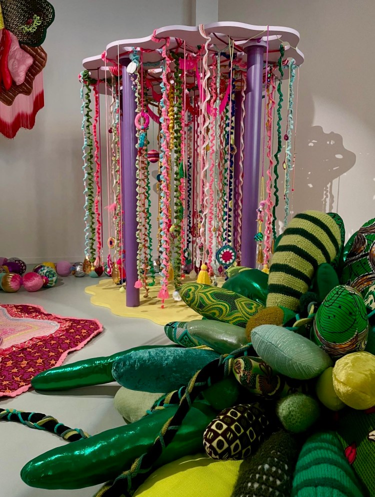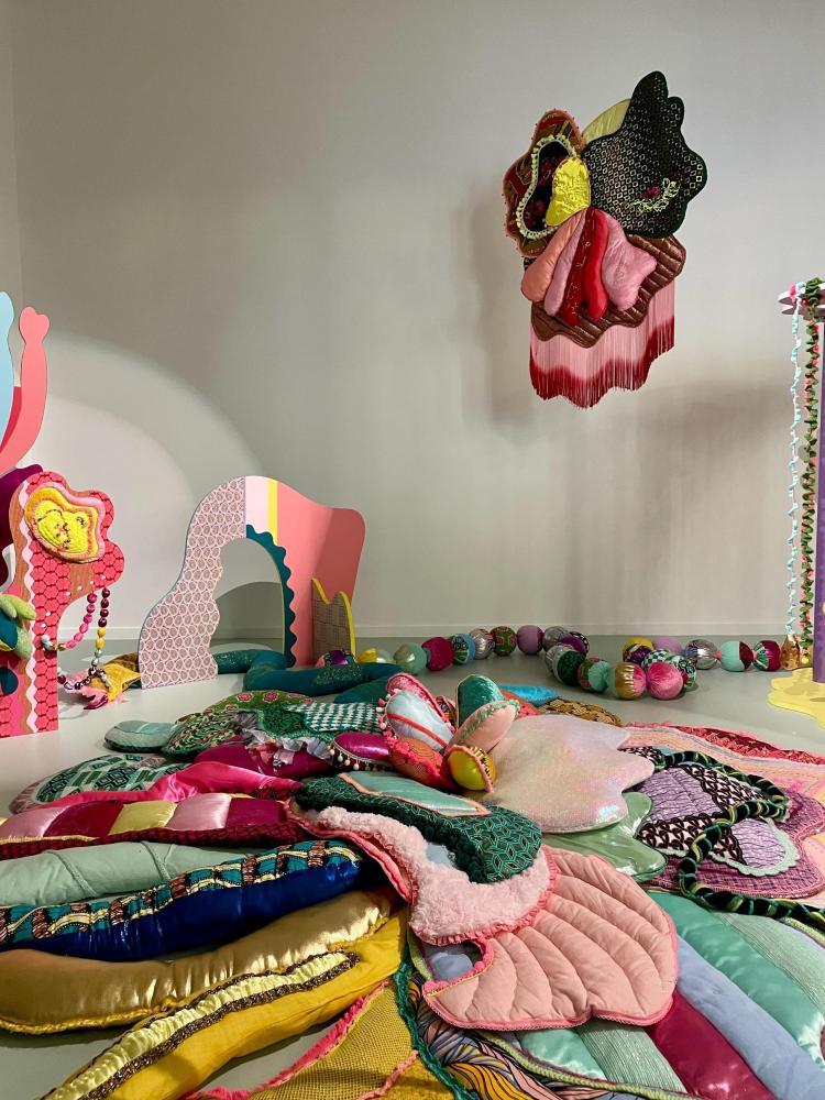 Shinny Paradise, 2022, tissus, broderie manuelle et familiale, crochet, sequins, toile de jute, perles, 290 x 200 x 200 cm. Prix de la Manufacture 2022