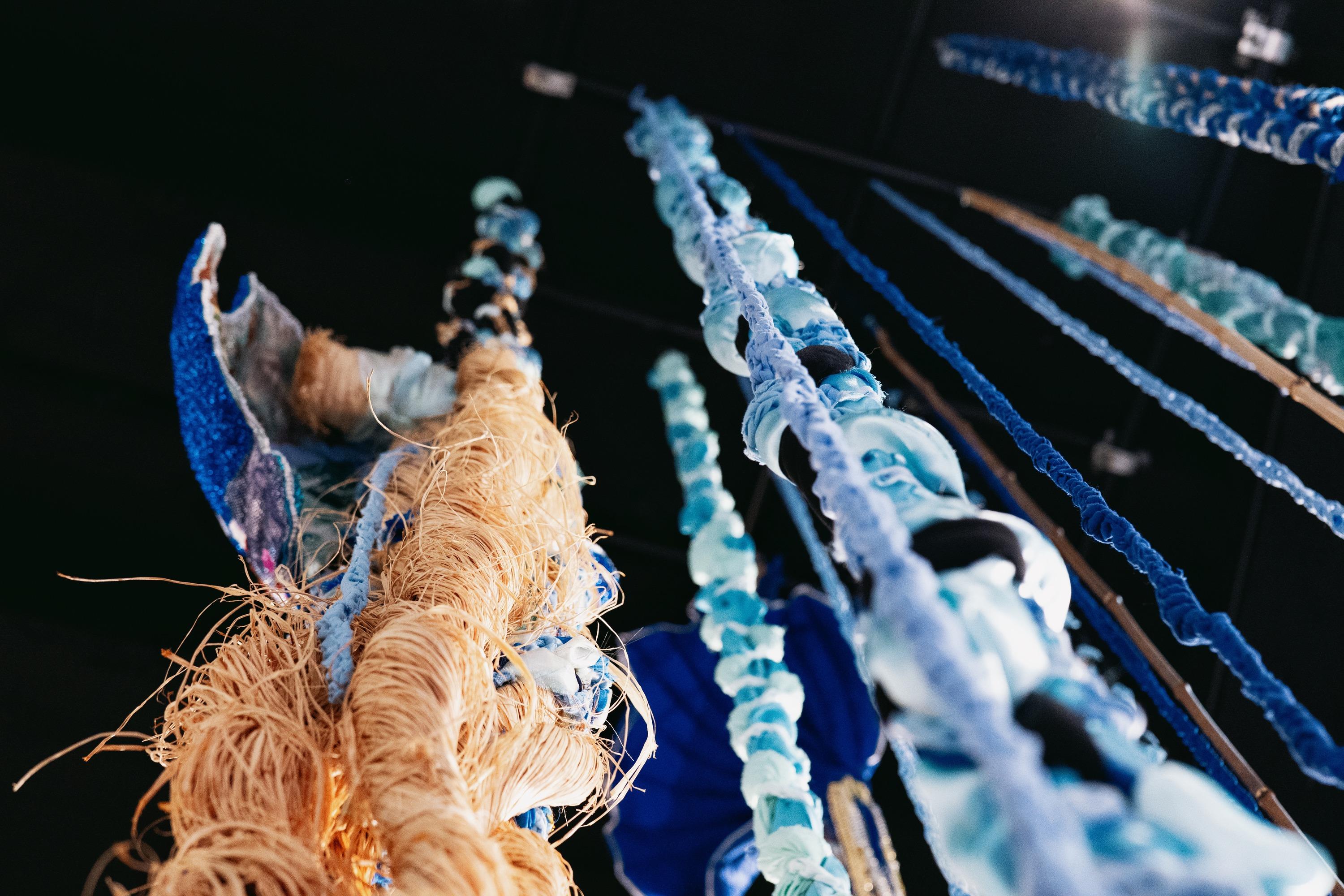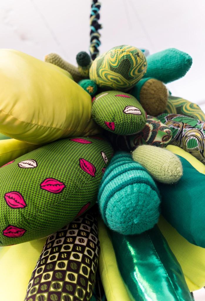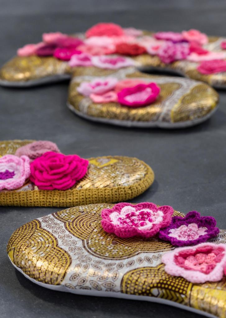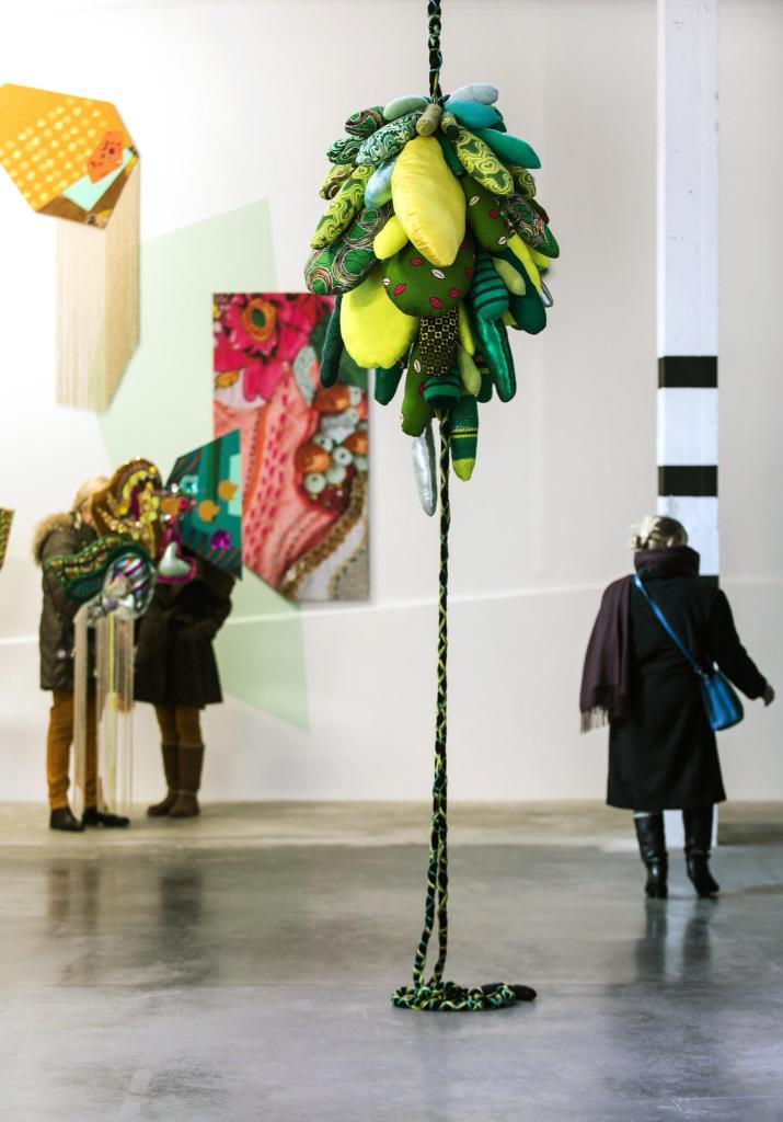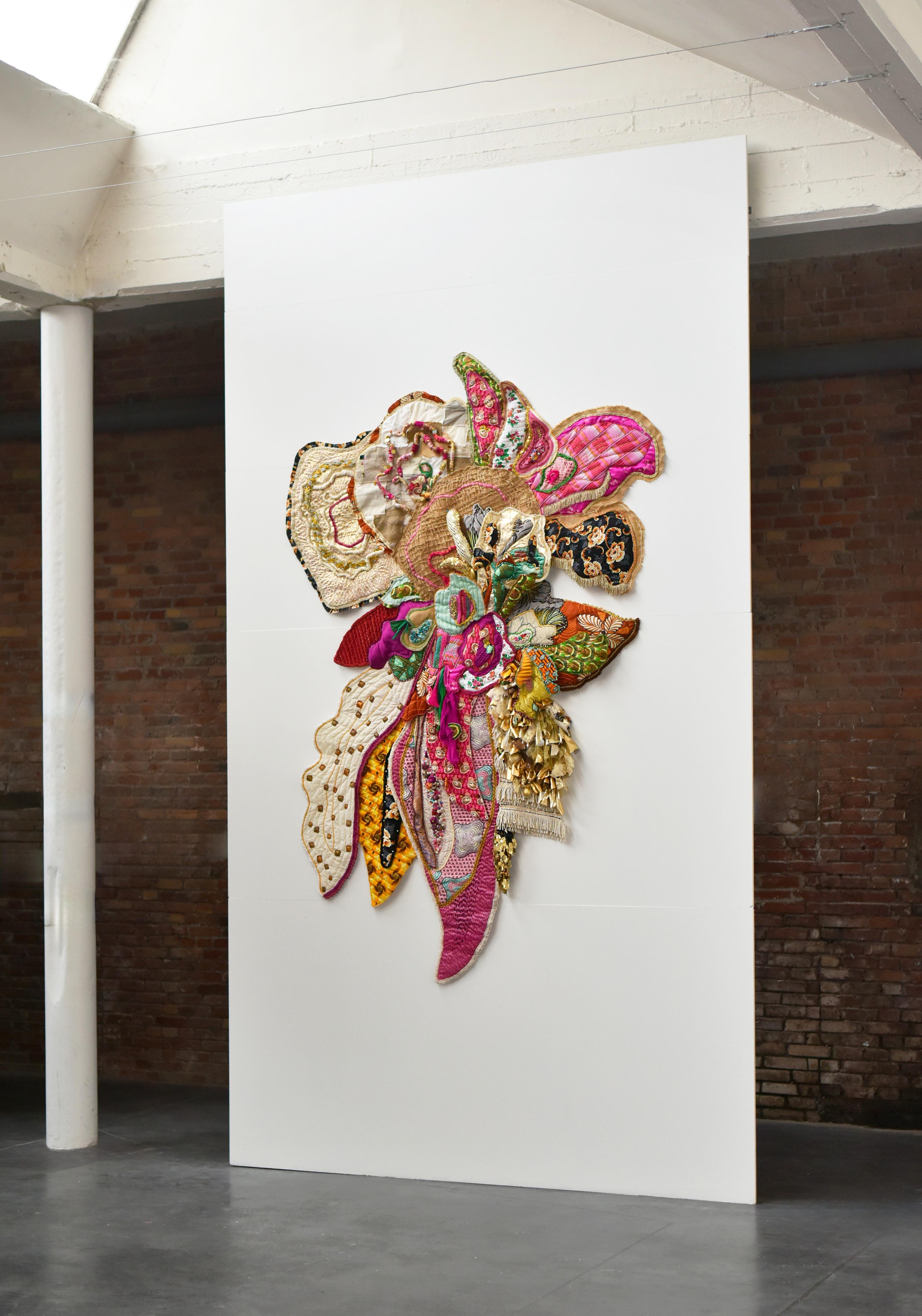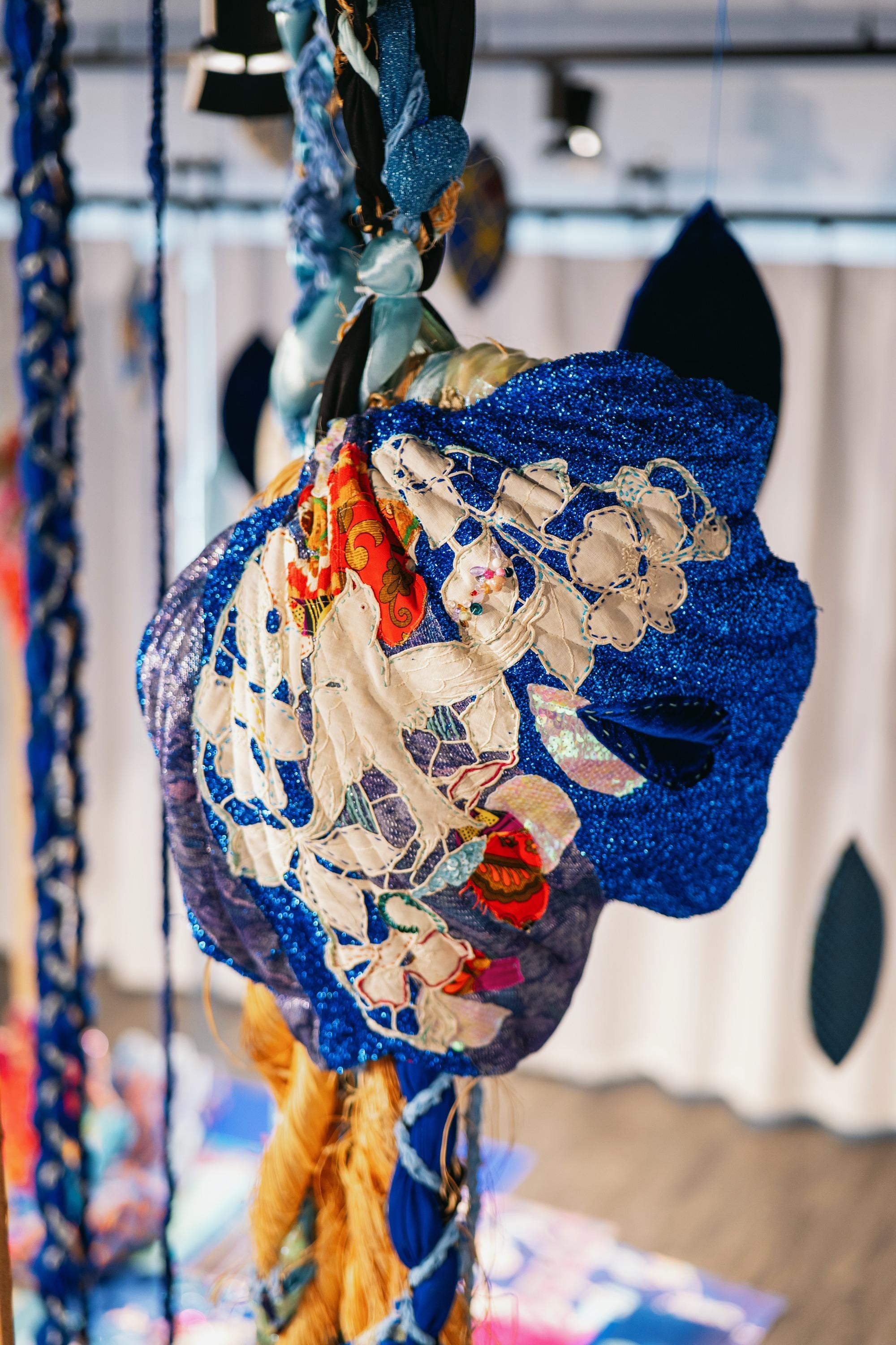 Shinny Paradise, 2022, tissus, broderie manuelle et familiale, crochet, sequins, toile de jute, perles, 290 x 200 x 200 cm. Prix de la Manufacture 2022