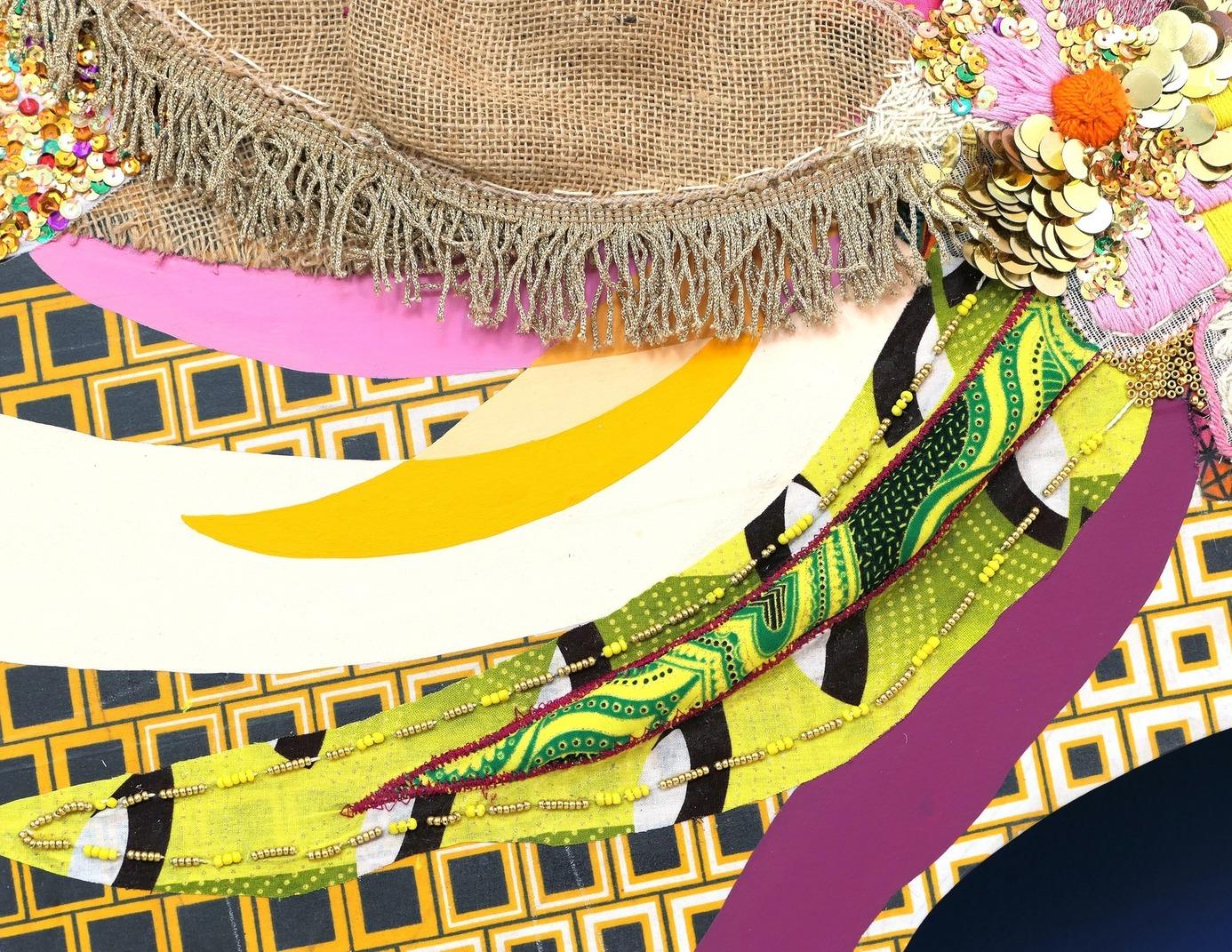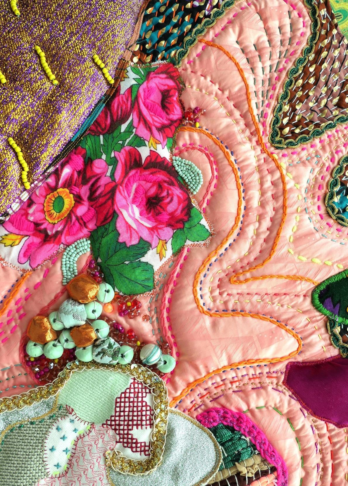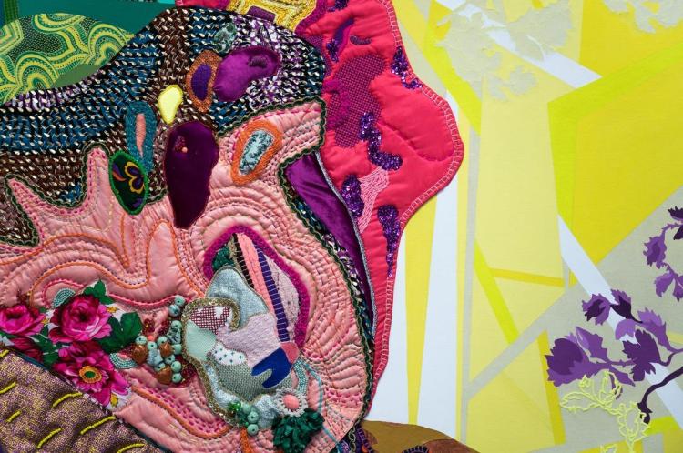 A tire-d’Elles, 2019, acrylique, tissus, broderies, sequins, perles, acrylique, support bois, 190×210 cm hors modules