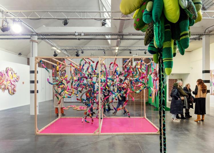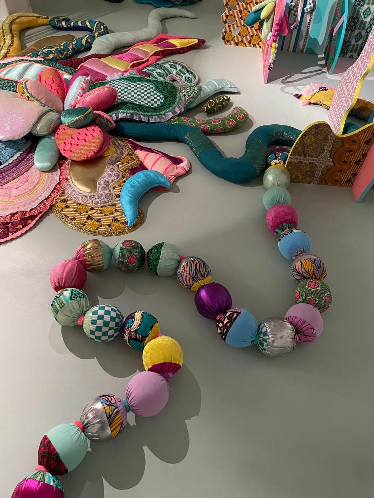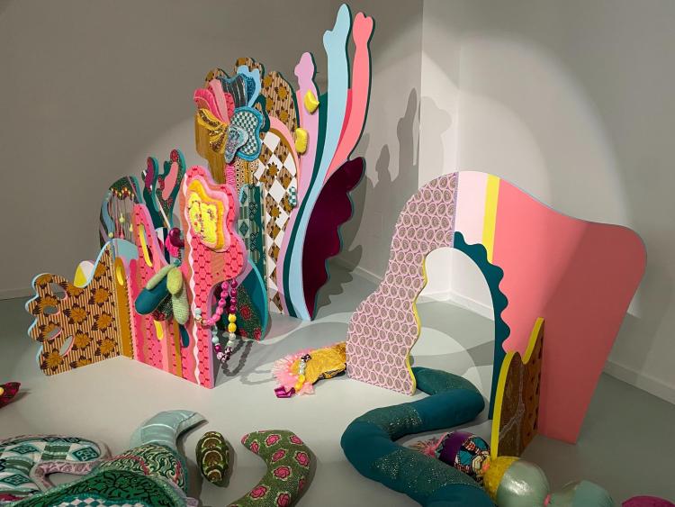 Dispositif artistique HAPPY POP, produit par le Centre Pompidou, 2025. Textile, crochet, broderie, perles, coquillages, tricot, panneaux de bois marouflés de textiles et peints.