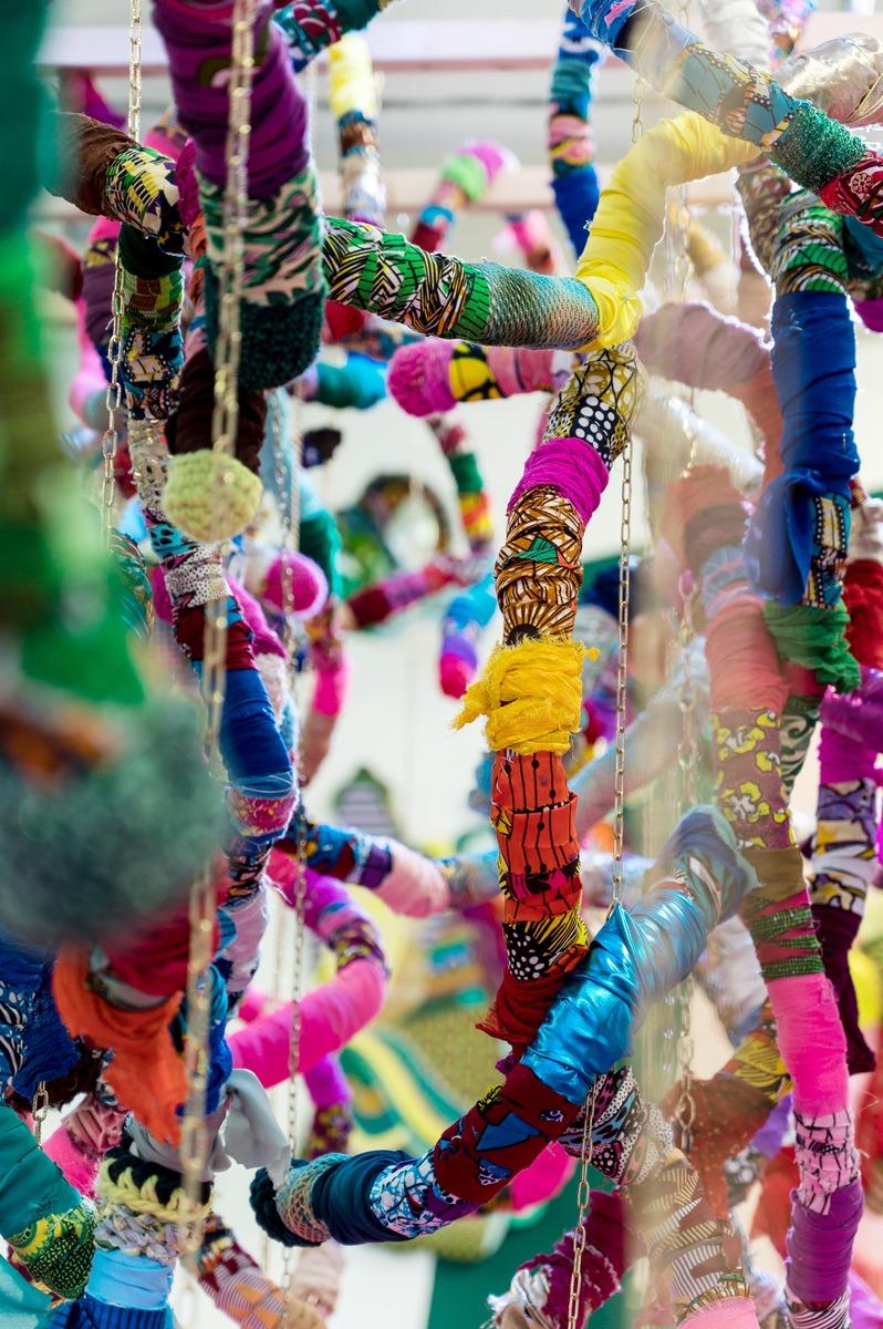 L’Ajoupa Bouillon, 2023, tissus, crochet, tricot, chaîne métallique, 120x400x110cm, oeuvre réalisée avec le soutien du Gang des Tricoteuses de La Manufacture de Roubaix