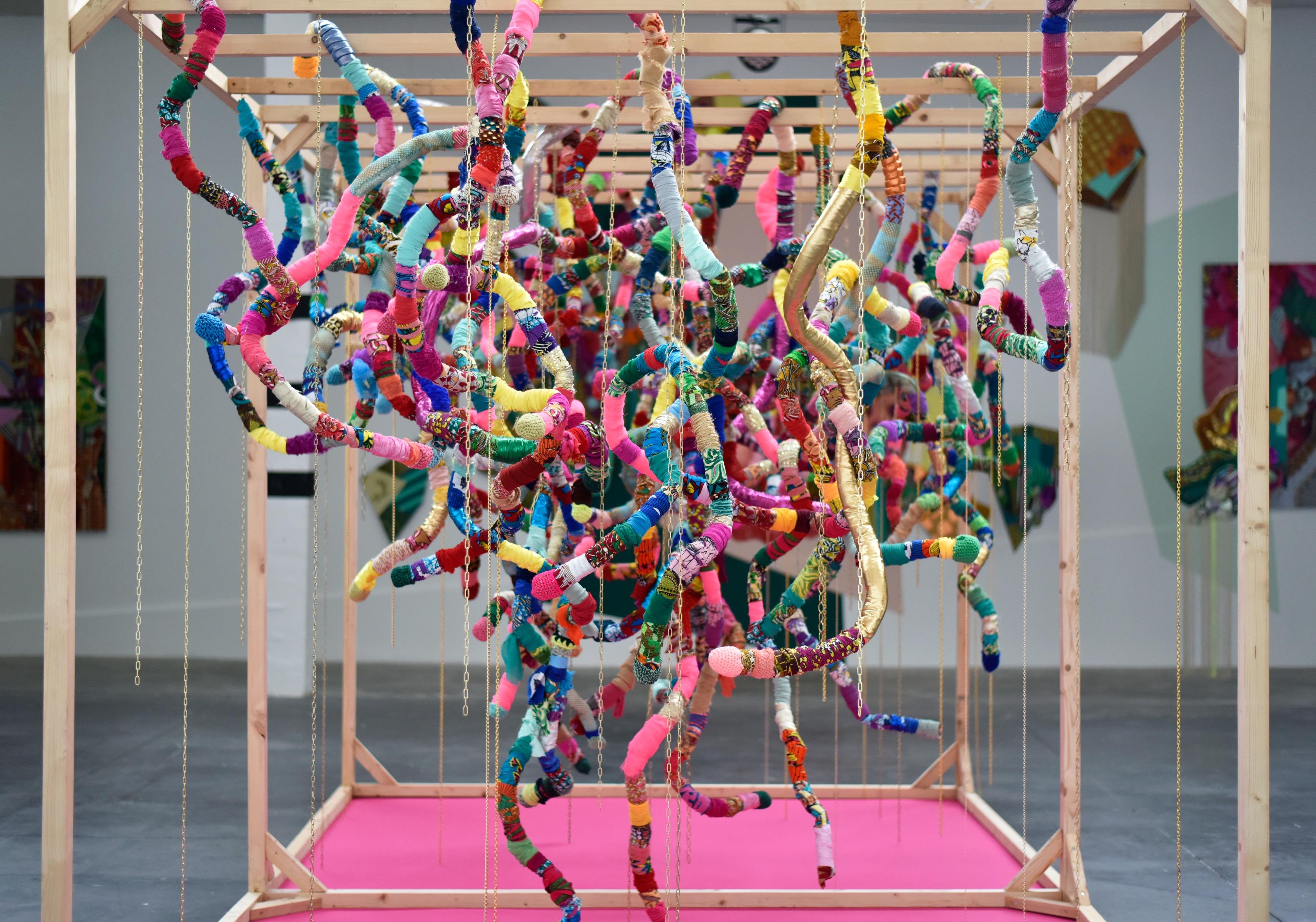 Effacer les limites, 2023, textiles, chaînes métalliques, crochet, bois, 250x400x250 cm