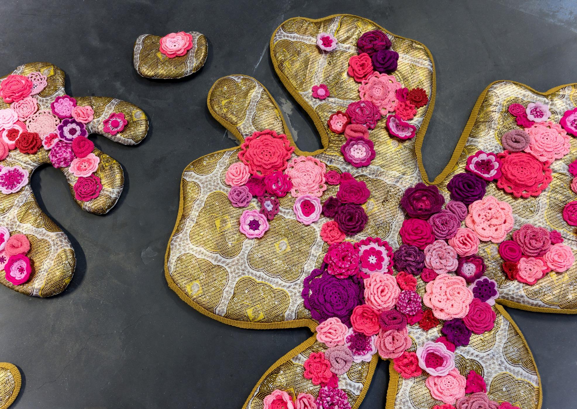 Mais où est passé le Flower Power ? 2023, Tissus, crochet, tricot, 165 x 170 cm, Oeuvre réalisée avec le soutien du Gang des Tricoteuses de La Manufacture de Roubaix